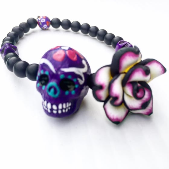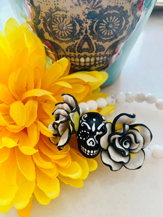 Dia De Los Muertos~ Hand Painted Howlite Skull and Onyx and wood