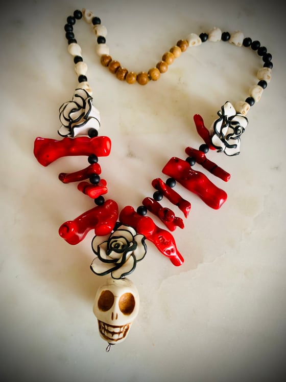 Dia De Los Muertos ~ Howlite Hand Painted Skull with Red Coral